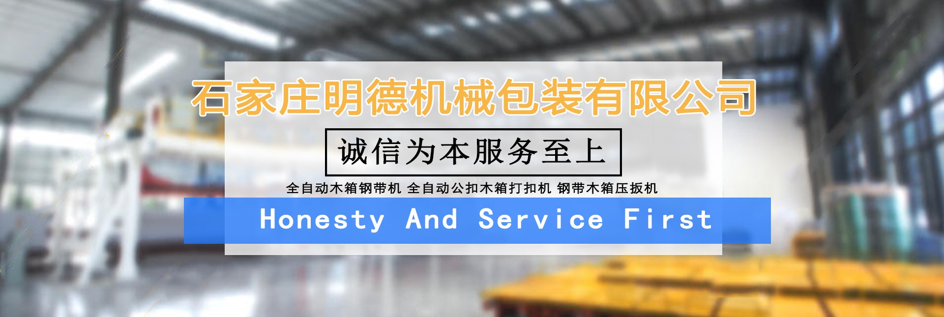 石家莊明德包裝機械有限公司,是國內專業生產木箱雙條鋼帶機、美式托盤打釘機械、托盤刨槽機、倒角機、木包裝箱、木托盤的生產廠家,目前擁有廠房3000多平方米,自動化生產設備數十套。 公司下轄包裝機械事業部,主要生產新型全自動木箱鋼帶機、全自動(半自動)木箱鎖扣機、折疊鋼帶箱機械、鋼帶箱壓板機、美式托盤自動打釘機、托盤刨槽機、倒角機等相關鋼帶木箱機械、木工機械、配套產品,設備主體部分由高品質機械和高精度模具組成,液壓系統、伺服系統和低壓配電單元的主要元器件,均選用西門子、施耐德等國際和國內產品,大大提升了產品質量,設備長時間運行穩定可靠,獲得了用戶的一致好評。 公司下轄包裝制品事業部,主要生產各種實木木箱、膠合板鋼帶木箱和實木熏蒸托盤、歐標托盤、美標托盤、亞標托盤及相關配套產品,木箱和托盤均選用優質九厘板材和俄羅斯原木作為原材料,從生產制造、成品組裝、出廠質檢到送貨上門,售后服務等,做到一條龍服務,始終堅持“把質量做到更好,把成本降到更低,把實惠讓給客戶“的經營原則。